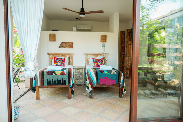 The ground floor bedroom is a twin room which has loads of storage and it's own terrace from which you can enjoy the morning sun. There are floor to ceiling sliding glass doors on two sides of the room which open up onto our garden and the terrace. This bedroom like the others has an AC unit and a ceiling mounted fan.