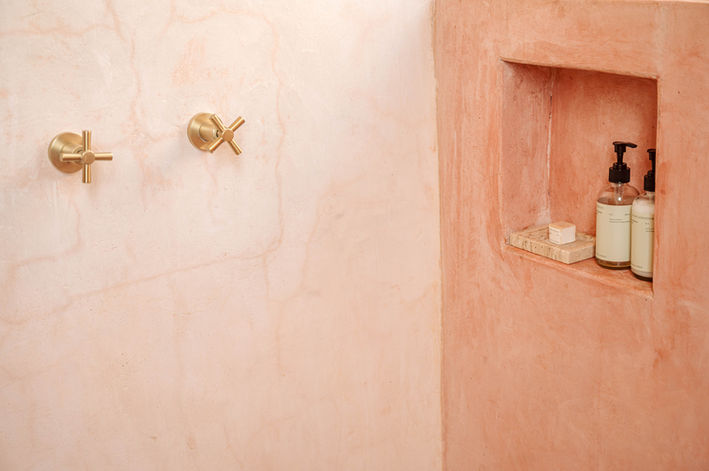 This bedroom contains a king size bed with an ensuite bathroom which is completely tiled in custom bespoke tiles from Guadalajara. The room has floor to ceiling sliding glass doors which open out on to a wraparound balcony filled with plants. The bathroom boasts a huge walk-in shower and his-and-hers sinks in pink concrete. .